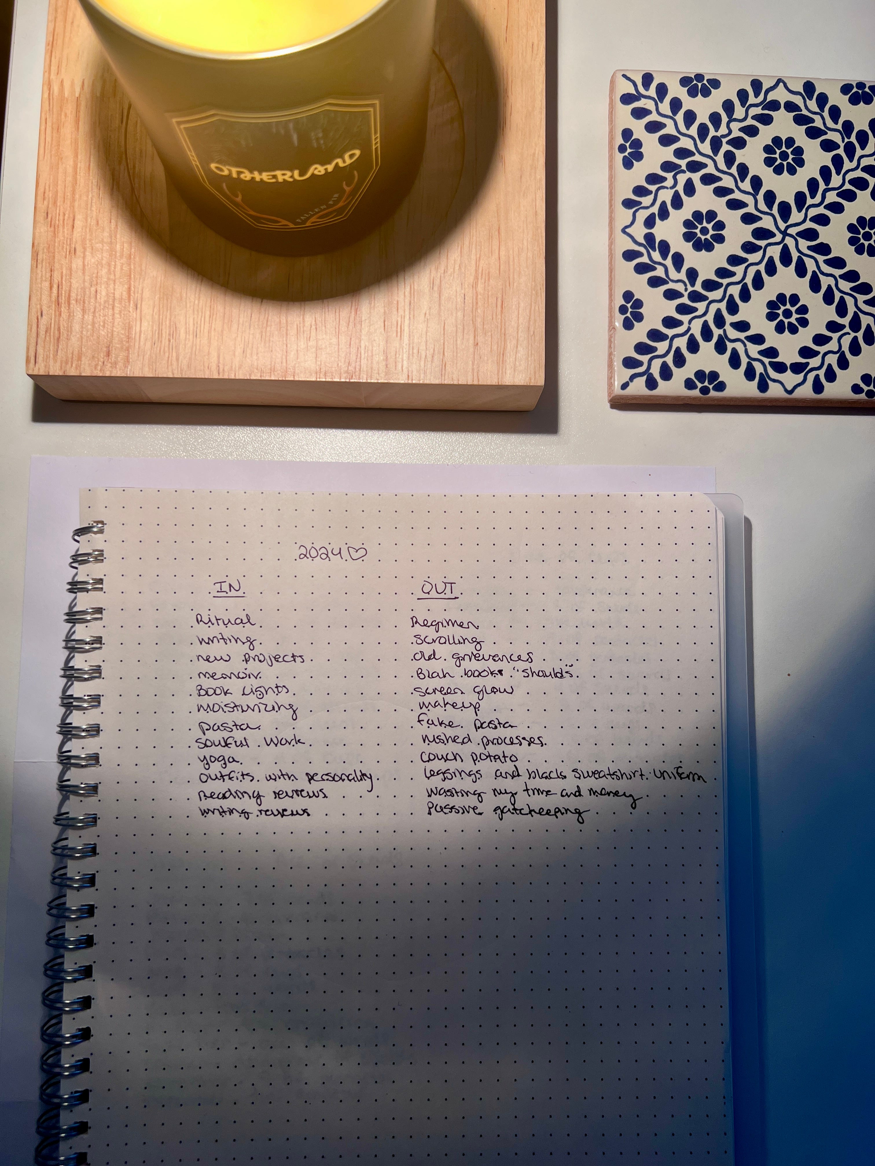 An ongoing in/out list. It’s the new year’s trend that we will likely look back on as “so 2024.” I’ve been keeping a notebook page open on my desk to add to mine as I think of them, instead of trying to squeeze them all out in one go. Here’s what I have so far. (I think my favorite so far is pasta/fake pasta. What are yours?)