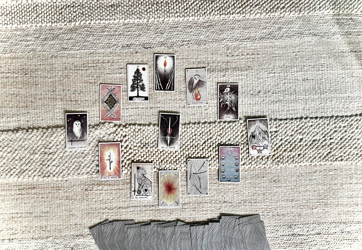 A tarot spread for the year ahead: one card pulled for each month, and one for the year. This tradition started several years ago, and it’s always so fun to see how the cards seem to *know*. For example, in 2019 my card for the year was “the lovers” — and on December 21st of that year my guy proposed ✨ Here’s my spread for 2024, with another little easter egg right off the bat.